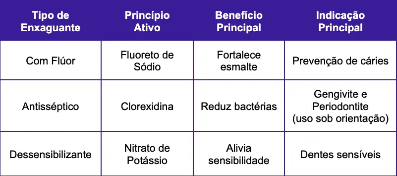 O Enxaguante Bucal: Complementa a limpeza mecânica, alcançando áreas de difícil acesso. Antissépticos com clorexidina são usados profissionalmente para tratar gengivite, enquanto opções com flúor ajudam na prevenção contínua de cáries.